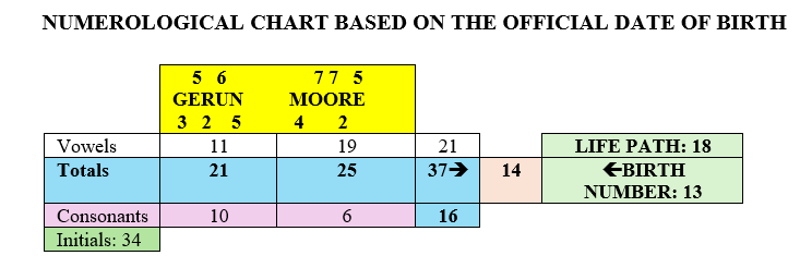 After changing his name, Gerun Moore retained some indicators for manifestation and spiritual qualities and gained more vibrations of love. His new TNN was 37, which is a highly favorable number. Moore referred to the TNN as the “ruling name number.” Name numbers brought very strong and favorable vibrations, despite the consonant number being 16. When an unfavorable number is surrounded by many positive numbers, its harmful influence is greatly reduced. Whether we consider the 13th or 10th of March as his birthday, the new vibrations are very favorable. Numbers 37 and 13 are also interchangeable, bringing more completeness to life. Additionally, these numbers have an alignment that can bring a youthful spirit.