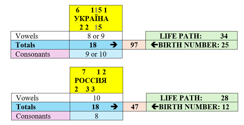 From the perspective of numerology, the Russo-Ukrainian war can also be understood through numbers. Both Ukraine and Russia have a Total Name Number (TNN) of 18. This number reflects the acts of their elites. Sepharial describes this compound number as: “false sense of security; unprofitable associations with women; hidden perils; treacheries; deceptions.” Cheiro offers the following interpretation: “it indicates making money and position through wars or by wars. It is, however, a warning of treachery, deception by others, also danger from the elements, such as storms, danger from water, fires and explosions.“