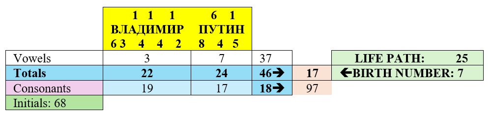From the names of the two countries and their key numerical dates, we cannot deduce a significant risk of severe wars. Thus, we must examine the numbers of the leaders of Russia and Ukraine. It is important to avoid analyzing the English versions of their names, a common mistake among Chaldean numerologists who fail to recognize the greater influence of numbers in their original forms. In the international context, the English version undoubtedly has an influence as well (Ukraine = 6+2+2+1+1+5+5 = 22 and Russia = 2+6+3+3+1+1 = 16), but this operates more in the background.
