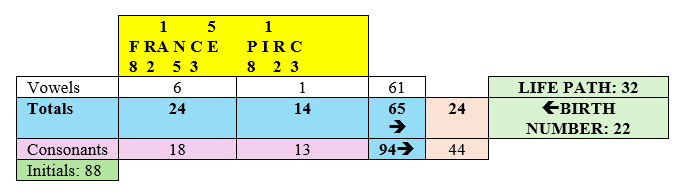 From a numerological standpoint, his chart shows a strong presence of the number 4. In Chaldean numerology, 4 is typically influenced by the Sun, but can also fall under the influence of Uranus or the North Node. In Pirc’s case, his chart indicates a dominant Uranian influence, which may explain his fascination with aviation. A strong presence of the number 5 alongside the number 4 may bring influences typically found in Aquarius and Gemini, both air signs. His consonants reveal a connection between the numbers 18 and 13, which are associated with war, explosions, death, and sudden reversals.