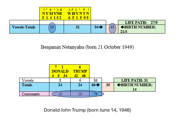 Benjamin Netanyahu’s numerological chart shows the dominance of the military numbers 18 and 43 and a very poor relationship between the numbers 3 and 7, which significantly worsens the qualities of 18 and 43. Donald Trump has the numbers 16, 18, and 79 in his chart, as well as the same poor relationship between 3 and 7. The numbers 79 and 43 can have similar effects and may represent wars. The numbers 16 and 79 also represent the “Falling Tower.” This can symbolize destroyed buildings. Considering the war with Iran, the “Falling Tower” also aptly symbolizes the fire following the attack on the Dubai skyscraper Burj Al Arab. Finally, in recent years Trump’s ownership of his own Trump Tower has also been threatened.