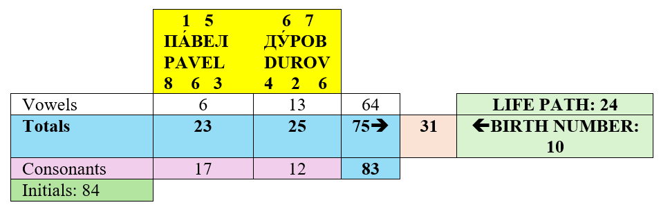 However, the repeated number 12 (75, 84) still indicates that a person can become a victim, especially if he or she also sacrifice others. As mentioned, 12 is a karmic number. The number 11 (83) can represent legal disputes or opponents, too. Cheirodescribed the number 11 as: “It gives warning of hidden dangers, trial, and treachery from others.” The number 10 from his birth date can represent swings of fate, both upward and downward. It is known that Pavel Durov sold his company VKontakte, allegedly under pressure and for a lower price. Soon after, he fled Putin’s regime, relocating to a safer environment and focusing on developing Telegram. But even then, there were difficulties—on August 24, 2024, he was arrested in France for allegedly allowing criminal organizations to connect on Telegram.